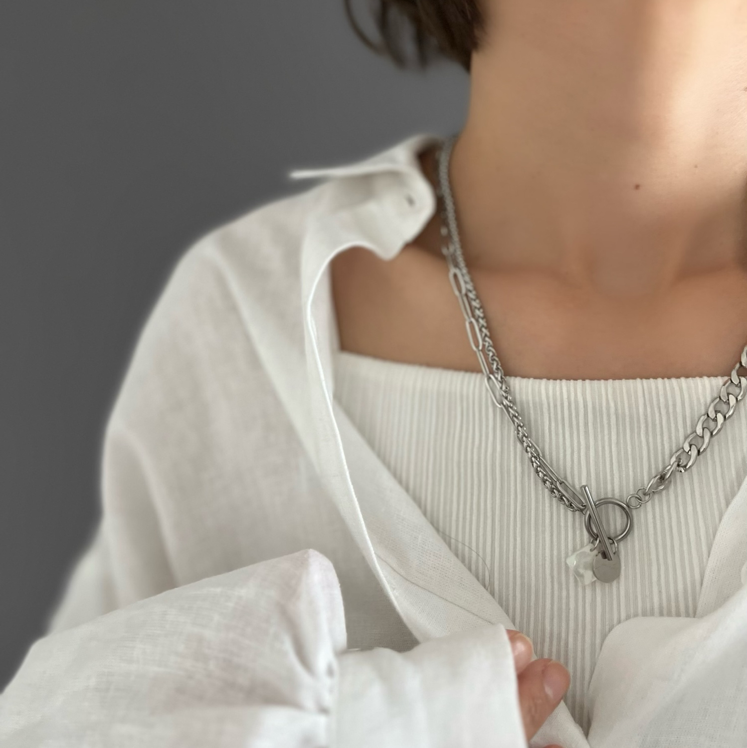 ,【주간 랭킹 들이】【인기No1】【실버】화이트 쉘과 믹스체인 목걸이 스테인리스 목걸이 쉘 ..